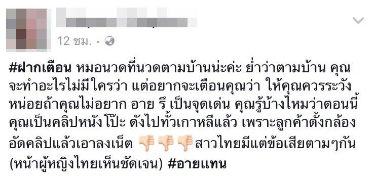วันที่ 13 มี.ค. "ข่าวสดออนไลน์" ได้รับการร้องเรียนจากคนไทยที่อาศัยอยู่ในประเทศเกาหลีถึงการเตือนภัยหากคิดจะมาทำงานที่นี่ โดยกรณีนี้เหตุเกิดกับสาวไทยรายหนึ่งที่มีอาชีพเป็นหมอนวดไปบริการตามบ้านลูกค้าซึ่งเป็นชาวเกาหลี โดยนอกจากนวดตามร่างกายแล้ว ลูกค้าจะมีการเจรจาต่อรองขอมีเพศสัมพันธ์โดยระบุว่าจะให้เงินเพิ่ม เมื่อมีการยินยอมแล้ว ลูกค้าคนดังกล่าวกลับแอบตั้งกล้องถ่ายคลิปขณะที่กำลังมีเพศสัมพันธ์แล้วนำไปเผยแพร่ลงเว็บโป๊ จนกลายเป็นนางเอกทางลบดังชั่วข้ามคืน