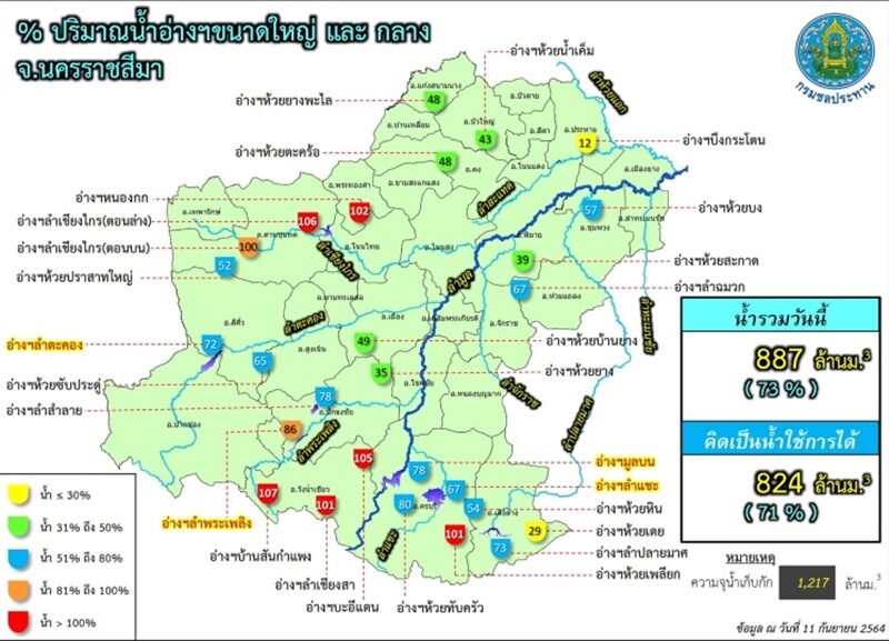 วันที่ 11 ก.ย. 2564 นายกิติกุล เสภาศีราภรณ์ ผอ.โครงการชลประทานนครราชสีมา กล่าวถึงสถานการณ์น้ำในพื้นที่จ.นครราชสีมา ว่า 4 อ่างเก็บน้ำขนาดใหญ่ 23 อ่างเก็บน้ำขนาดกลางของจังหวัดฯปัจจุบั มีปริมาณน้ำภาพรวมอยู่ประมาณ 71.40 % ของความจุอ่างเก็บน้ำทั้งหมด ซึ่งอ่างเก็บน้ำขนาดใหญ่ที่มีน้ำจุเกิน 80% แล้ว มี 1 แห่ง ได้แก่