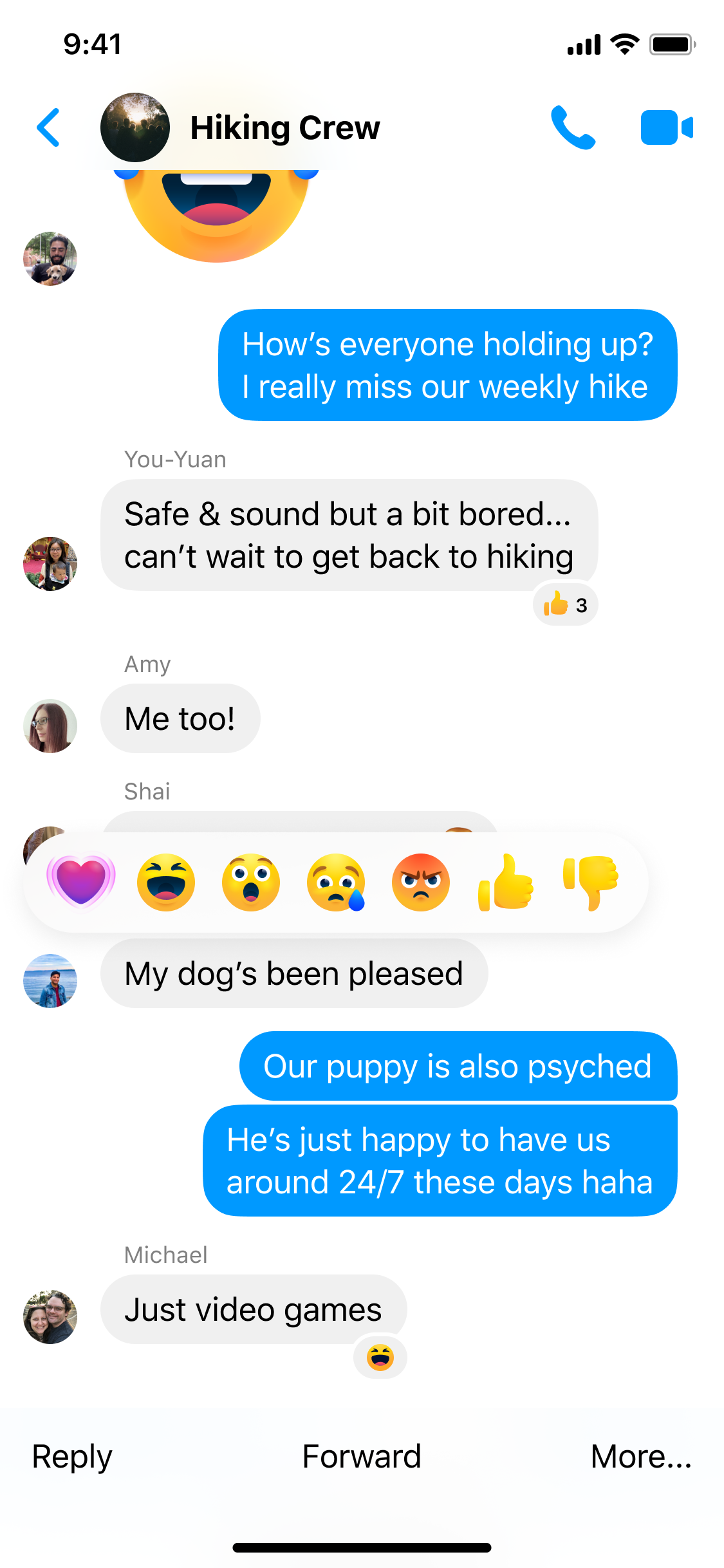 ด้วยเหตุนี้ เราจึงได้เปิดตัวปุ่มไอคอนแสดงความรู้สึกชุดใหม่บน Facebook และ Messenger เพื่อให้ผู้คนสามารถให้กำลังใจกันและกันในระหว่างสถานการณ์ที่ไม่เคยเกิดขึ้นมาก่อนเช่นนี้ โดยได้เริ่มให้บริการบน Messenger เป็นที่เรียบร้อยแล้ว และจะเริ่มให้บริการบน Facebook ในวันที่ 23 เมษายนเป็นต้นไป ซึ่งปุ่มแสดงความรู้สึกเหล่านี้ถูกออกแบบเพื่อการใช้งานชั่วคราว เพื่อให้ผู้คนสามารถแสดงความห่วงใยกันและกันในช่วงเวลานี้เท่านั้น