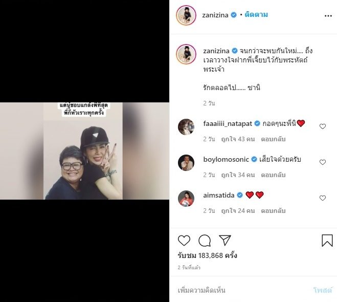 พร้อมทั้งโพสต์ MV สุดเศร้าถึงพี่เจี๊ยบ พร้อมเผยด้วยว่า “จนกว่าจะพบกันใหม่…. ถึงเวลาวางใจฝากพี่เจี๊ยบไว้กับพระหัตถ์พระเจ้า รักตลอดไป…… ซานิ” โดยมีทั้งเพื่อนๆในวงการและแฟนคลับเข้ามาร่วมแสดงความเสียใจและให้กำลังใจจำนวนมาก