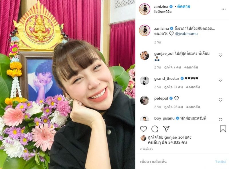 สาวซานิยังเผยภาพไปร่วมอาลัยในงานศพ พร้อมถ่ายภาพอาลัยหน้าศพ และบอกกับพี่เจี๊ยบที่มีมิตรภาพดีงามยาวนานไม่หมดไป แม้วันที่พี่ที่รักไปอยู่บนฟ้าด้วยว่า “ถึงเวลาไปด้วยกันตลอด… ตลอดไป @jeabmumu”