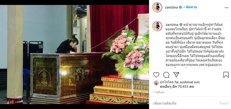 พร้อมทั้งเผยภาพสุดอาลัยสาวซานิกอดที่โลง พร้อมเผยสุดเศร้ามากๆด้วยว่า “หน้าต่างบานเล็กๆนู๋ทำได้แค่มองตะโกนเรียก นู๋ทำได้เท่านี้ คำว่าแฟนคลับที่ทุกคนใช้กับนู๋ นู๋เลิกใช้มานานแล้ว ทุกคนเป็นครอบครัว