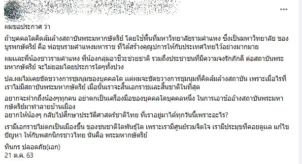 ปล.ผมไม่เคยขัดขวางการชุมนุมของบุคคลใด เเต่ผมจะขัดขวางการชุมนุมที่คิดล้มล้างสถาบัน เพราะเมื่อไรที่เราไม่มีสถาบันพระมหากษัตริย์ เมื่อนั้นเราจะสิ้นเอกราชเเละสิ้นชาติในที่สุด