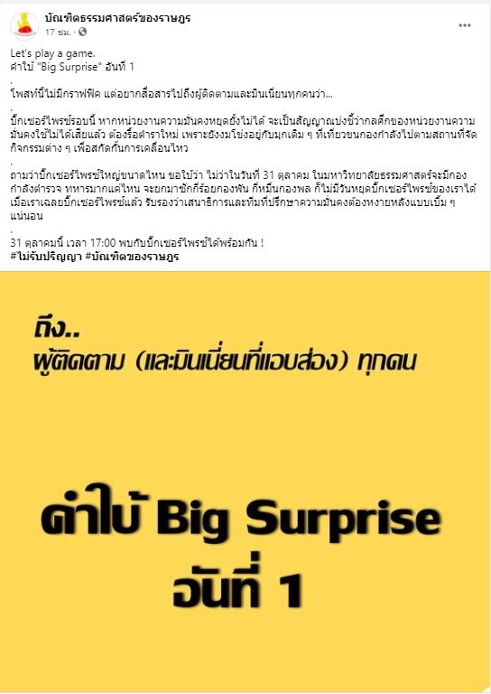 วันที่ 30 ต.ค.63 เพจ บัณฑิตธรรมศาสตร์ของราษฎร โพสต์ถึงกลุ่มราษฎรเตรียมมีบิ๊กเซอร์ไพรส์ในวันที่ 31 ต.ค.ว่า Let's play a game คำใบ้ "Big Surprise" อันที่ 1 โพสต์นี้ไม่มีกราฟฟิก แต่อยากสื่อสารไปถึงผู้ติดตามและมินเนียนทุกคนว่า บิ๊กเซอร์ไพรส์รอบนี้ หากหน่วยงานความมั่นคงหยุดยั้งไม่ได้ จะเป็นสัญญาณบ่งชี้ว่ากลศึกของหน่วยงานความมั่นคงใช้ไม่ได้เสียแล้ว ต้องรื้อตำราใหม่ เพราะยังงมโข่งอยู่กับมุกเดิมๆ ที่เที่ยวขนกองกำลังไปตามสถานที่จัดกิจกรรมต่างๆ เพื่อสกัดกั้นการเคลื่อนไหว