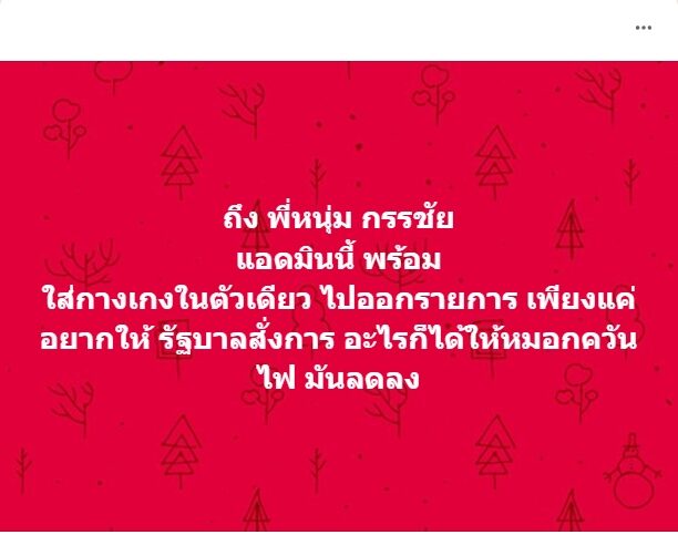 ผู้ใช้เฟซบุ๊กรายหนึ่งที่เป็นแอดมินกลุ่ม Lampang City ซึ่งเป็นกลุ่มแจ้งเรื่องราวข่าวสารใน จ.ลำปาง ที่มีสมาชิกมากถึง 3 แสนคน โพสต์ข้อความลงกลุ่ม ระบุว่าถึง พี่หนุ่ม กรรชัย แอดมินพร้อมใส่กางเกงในตัวเดียว ไปออกรายการ เพียงแค่อยากให้ รัฐบาลสั่งการ อะไรก็ได้ให้หมอกควันไฟ มันลดลง โดยในโพสต์ดังกล่าวมีผู้เข้ามาแสดงความคิดเห็นเกือบ 300 ครั้ง