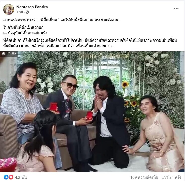 “ภาพแห่งความทรงจำ…พี่ติ๊กเป็นเถ้าแก่ให้กับฝั่งพี่เสก ขอภรรยาแต่งงาน… ในครั้งนั้นพี่ติ๊กเป็นเถ้าแก่ ณ ปัจจุบันก็เป็นตาแก่คนนึง พี่ติ๊กเป็นคนที่ไม่เคยโกรธเกลียดใคร(ถ้าไม่จำเป็น) มีแต่ความรักและความจริงใจให้…มิตรภาพความเป็นเพื่อนนั้นมันมีความหมายลึกซึ้ง…เหมือนคำคมที่ว่า เพื่อนเป็นแล้วหายยาก…” ท่ามกลางคอมเมนต์ต่างๆ นานา