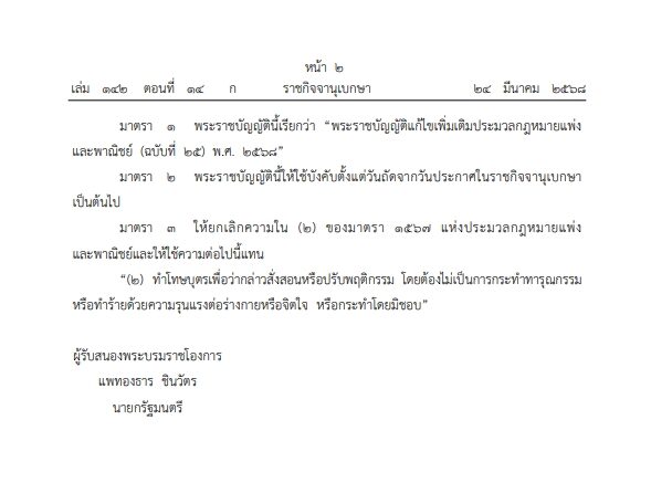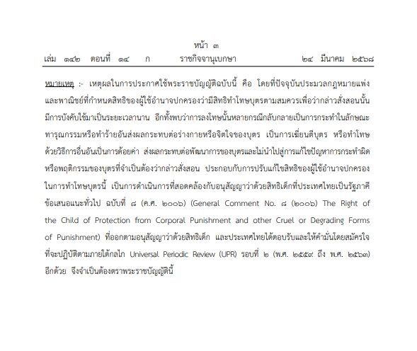 อ่านข่าวต้นฉบับได้ที่ : ราชกิจจาฯ ประกาศ กฎหมาย (แก้ไข) ใหม่ ข้อห้าม "ลงโทษบุตร" บังคับใช้