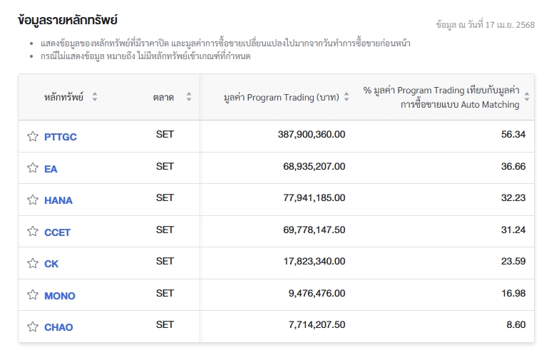 นอกจากนี้ ตลท.ยังรายงานข้อมูลหลักทรัพย์ที่ใช้ Program Trading ซื้อขายสูงสุด 24 อันดับ โดยเรียงจากเปอร์เซ็นต์ (%) มูลค่า Program Trading เทียบกับมูลค่าการซื้อขายแบบ Auto Matching ได้แก่ PTTGC,EA,HANA,CCET,CK,MONO,CHAO