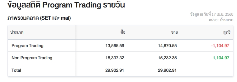 ผู้สื่อข่าวรายงานว่า วันนี้ (17 เม.ย.68) ตลาดหลักทรัพย์แห่งประเทศไทย (ตลท.) เปิดเผยข้อมูลซื้อขายรายวันผ่าน Program Trading หรือ “โปรแกรมโรบอทเทรดดิ้ง” มีมูลค่าซื้อจำนวน 13,565.59 ล้านบาท และมูลค่าขายจำนวน 14,670.55 ล้านบาท เท่ากับขายสุทธิ 1,104.97 ล้านบาท