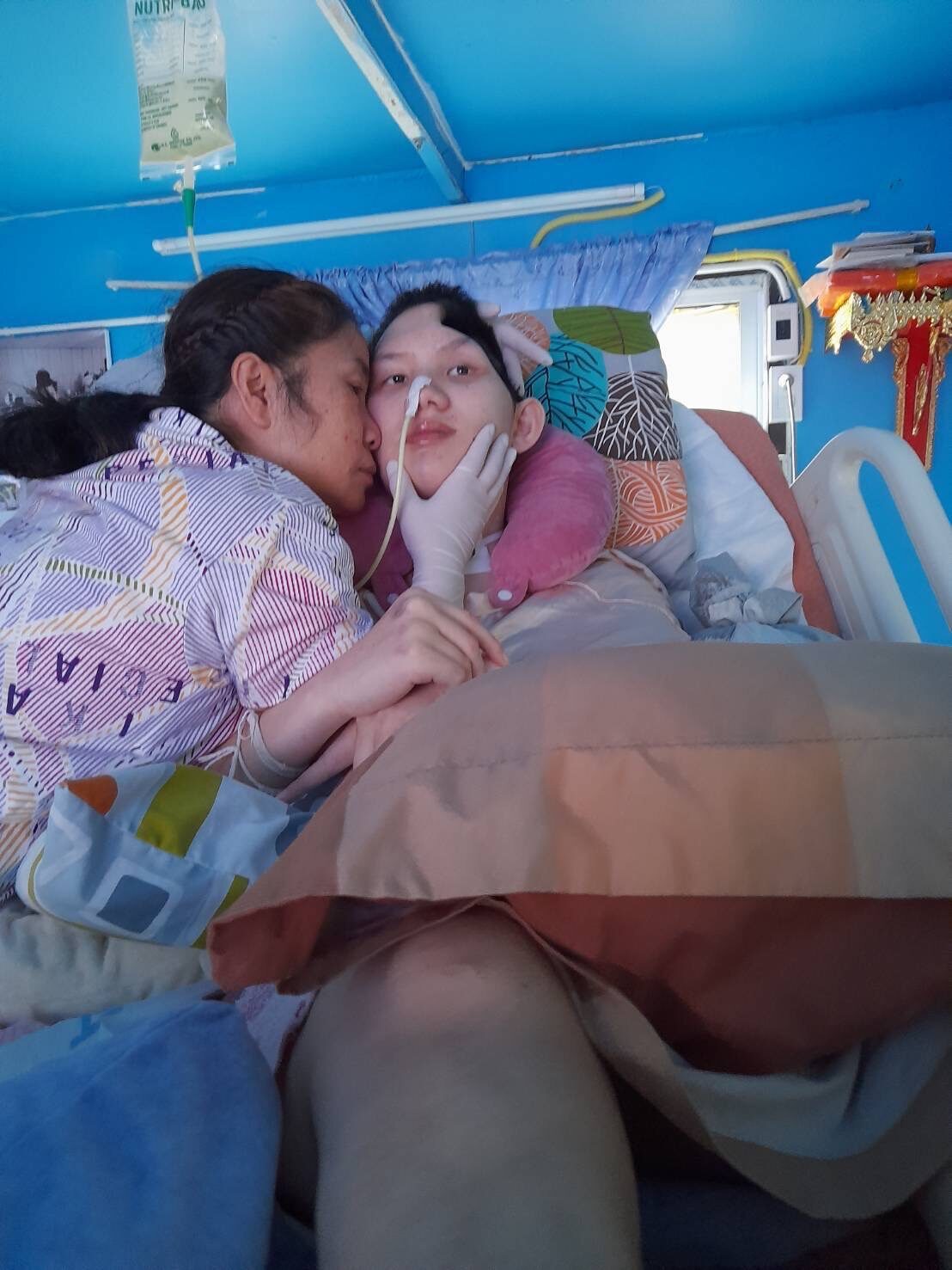 จริงๆ ก็ไม่ว่างหรอก ต้องทำต้องคอยดูน้อง ตอนนี้หลับก็ไม่เท่าไหร่ พอตื่นขึ้นมาก็จะมีฉี่มีอึก็ต้องทำความสะอาด ทุกอย่างวนเวียนอยู่แบบนี้ ได้นอนก็เที่ยงคืนตีหนึ่ง วนเวียนอย่างนี้มา น้องก็ต้องได้กินก่อน พอกินเสร็จก็ทำอย่างอื่นต่อ กายภาพอีก เช็ดเนื้อเช็ดตัวไม่ให้เขาเป็นแผลกดทับสักนิดก็ไม่มี ขี้หูขี้ตา น้ำลายน้ำมูกสักนิดก็ไม่มี แม่ก็ซักผ้า เช็ดถูห้องวนๆ แบบนี้ทุกวันค่ะ”