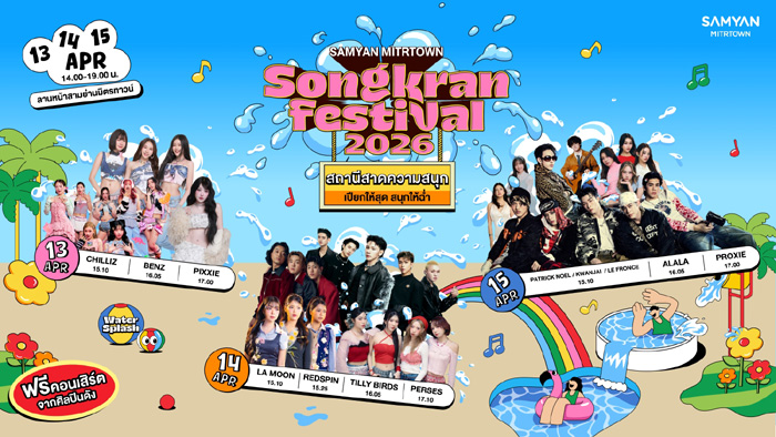 และ SAMYAN MITRTOWN SONGKRAN FESTIVAL 2026 13 - 15 เม.ย. 69 ตั้งแต่เวลา 14.00 – 19.00 น. MRT สถานีสามย่าน (ทางออก 2) สามารถติดตามรายละเอียดเพิ่มเติมได้ที่ FACEBOOK: SAMYAN MITRTOWN และ SILOM EDGE