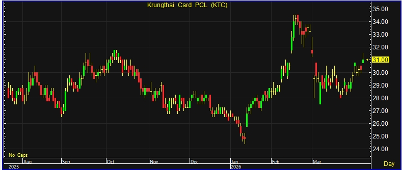 ด้านมุมมอง KS ยังคงแนะนำ “ซื้อ” KTC ราคาเป้าหมาย 41.00 บาท เชื่อว่าราคาหุ้นที่ปรับตัวขึ้น 12% นับตั้งแต่เริ่มต้นสงครามระหว่างสหรัฐฯ-อิหร่าน เป็นโอกาสที่ดีในการซื้อหุ้น เนื่องจาก KTC ดูเหมือนจะได้รับผลกระทบจากสงครามค่อนข้างจำกัด และ KS มั่นใจว่า KTC กำไรปี 2569 จะเติบโตได้ดีถึง 10% จากช่วงเดียวกันของปีก่อน (YoY)