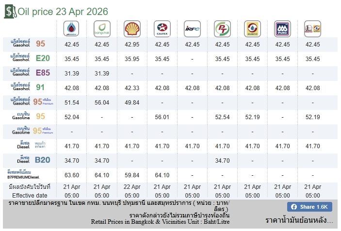 - ดีเซล B20 : 34.70 บาท/ลิตร
