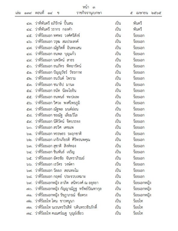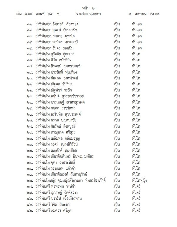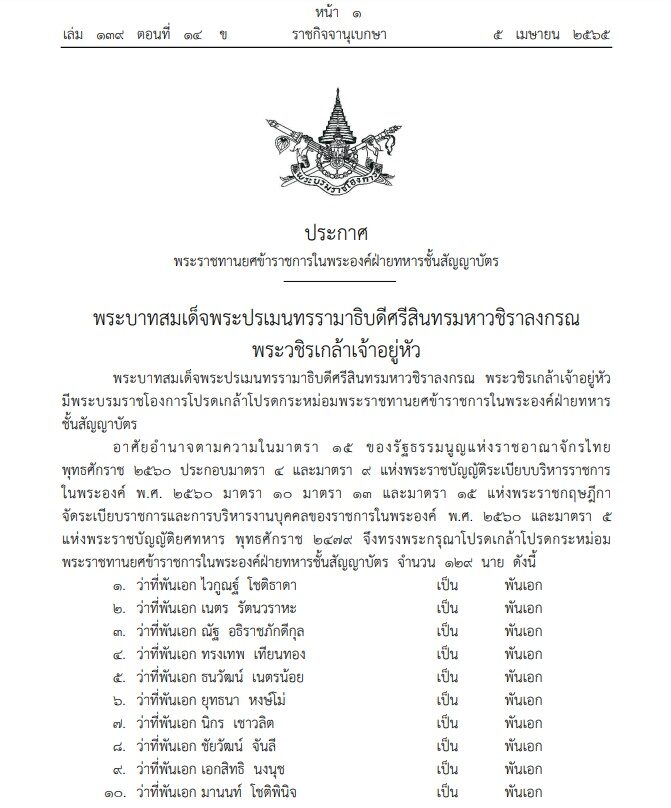 ผู้สื่อข่าวรายงานว่า เมื่อวันที่ 5 เม.ย.65 ราชกิจจานุเบกษา เผยแพร่พระบรมราชโองการ พระบาทสมเด็จพระปรเมนทรรามาธิบดีศรีสินทรมหาวชิราลงกรณ พระวชิรเกล้าเจ้าอยู่หัว ประกาศพระราชทานยศข้าราชการในพระองค์ฝ่ายทหารชั้นสัญญาบัตร