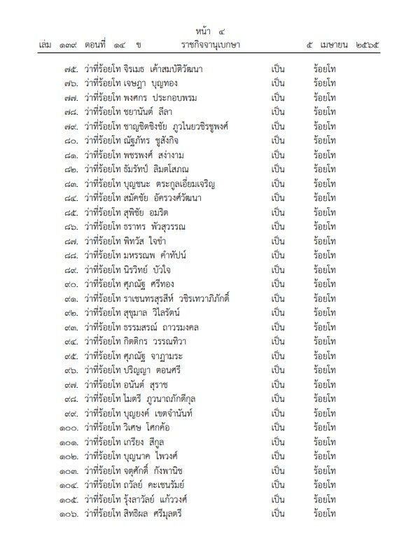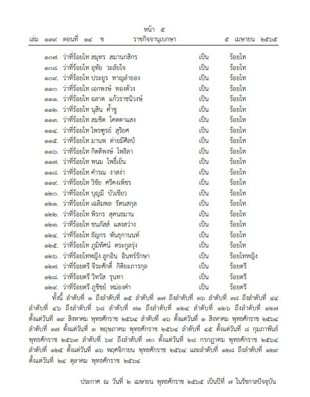 โปรดเกล้าฯ พระราชทานยศ 129 นาย และว่าที่พ.ท.หญิง คุณหญิงสิริกานดา ทิพยวชิราภักดิ์ โดยราชกิจจานุเบกษา เผยแพร่ในเว็บไซต์แล้ว