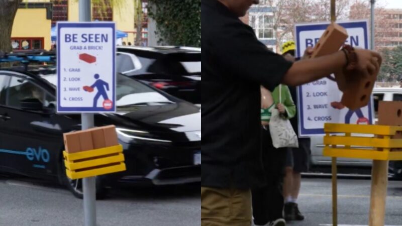 วิชันซีโร่แวนคูเวอร์ กลุ่มไม่แสวงกำไรในแวนคูเวอร์ได้เสนอวิธีแก้ปัญหาที่ตลกขบขันเนื่องในวันเอพริลฟูลส์ สำหรับปัญหาการไม่หยุดรถให้คนข้ามถนนผ่านทางเอ็กซ์ (ทวิตเตอร์) โดยคลิปวิดีโอดังกล่าวแสดงภาพอิฐโฟมที่ดูสมจริงเพื่อให้คนเดินถนนใช้เพื่อ 'ข่มขู่' ยานพาหนะให้ชะลอความเร็วและหยุดให้พวกเขาที่ทางม้าลาย ซึ่งชาวแคนาดาต่างชื่นชอบไอเดียนี้