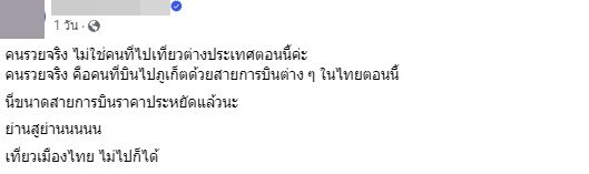 “คนรวยจริง ไม่ใช่คนที่ไปเที่ยวต่างประเทศตอนนี้ค่ะ คนรวยจริง คือคนที่บินไปภูเก็ตด้วยสายการบินต่าง ๆ ในไทยตอนนี้