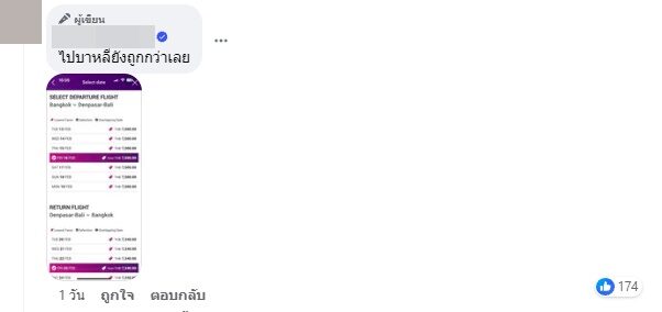 อีกทั้งยังได้คอมเมนต์เพิ่มเติม ด้วยภาพราคาตั๋วเครื่องบิน กรุงเทพฯ – บาหลี ด้วยข้อความว่า “ไปบาหลียังถูกกว่าเลย” หากเดินทางไปช่วงวันที่ 13-19 กุมภาพันธ์ 2567 ราคาอยู่ที่ 7,500 บาท ส่วนขากลับ บาหลี – กรุงเทพ ช่วงวันที่ 20-24 กุมภาพันธ์ 2567 ราคาเพียง 7,340 บาทเท่านั้น