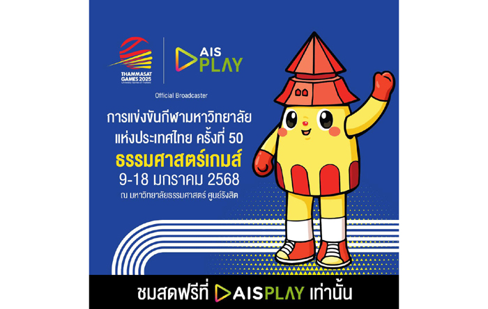 AIS ร่วมสนับสนุนการเปิดพื้นที่เพื่อแสดงศักยภาพอย่างสร้างสรรค์ของคนรุ่นใหม่ ด้วยการส่งต่อประสบการณ์ การรับชมการแข่งขันกีฬามหาวิทยาลัยแห่งประเทศไทย ครั้งที่ 50 “ธรรมศาสตร์เกมส์ 2025” บน AIS PLAY ในฐานะ Official Broadcaster เพียงรายเดียวเท่านั้น นับเป็นครั้งแรกในประวัติศาสตร์ของการจัดการแข่งขันกีฬามหาวิทยาลัย ที่มีการถ่ายทอดสดผ่านดิจิทัลแพลตฟอร์มในรูปแบบ FULL HD ให้คนไทยทุกเครือข่ายได้ชมสดฟรีพร้อมไฮไลท์และรีรันแบบจัดเต็ม 9 ช่องพิเศษ พร้อมนักพากย์ จุใจ 12 ประเภทกีฬา ได้แก่ กรีฑา ว่ายน้ำ ฟุตบอล วอลเลย์บอล บาสเกตบอล แบดมินตัน เซปักตะกร้อ เทควันโด เทนนิส ยูยิตสู ฟุตซอล และ eSports ได้ผ่าน AIS PLAY ทุกช่องทาง ตั้งแต่วันที่ 9 – 18 ม.ค. 2568