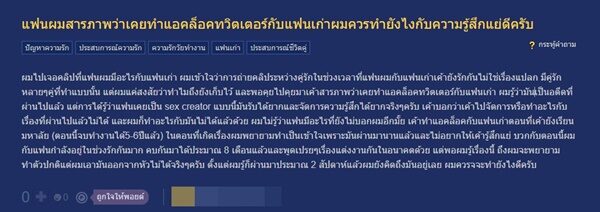 ผมรู้ว่ามันเป็นอตีดที่ผ่านไปแล้ว แต่การได้รู้ว่าแฟนเคยเป็น sex creator แบบนี้มันรับได้ยาก และจัดการความรู้สึกได้ยากจริง ๆ ครับ เขาบอกว่าเค้าไปจัดการหรือทำอะไรกับเรื่องที่ผ่านไปแล้วไม่ได้และผมก็ทำอะไรกับมันไม่ได้แล้วด้วย