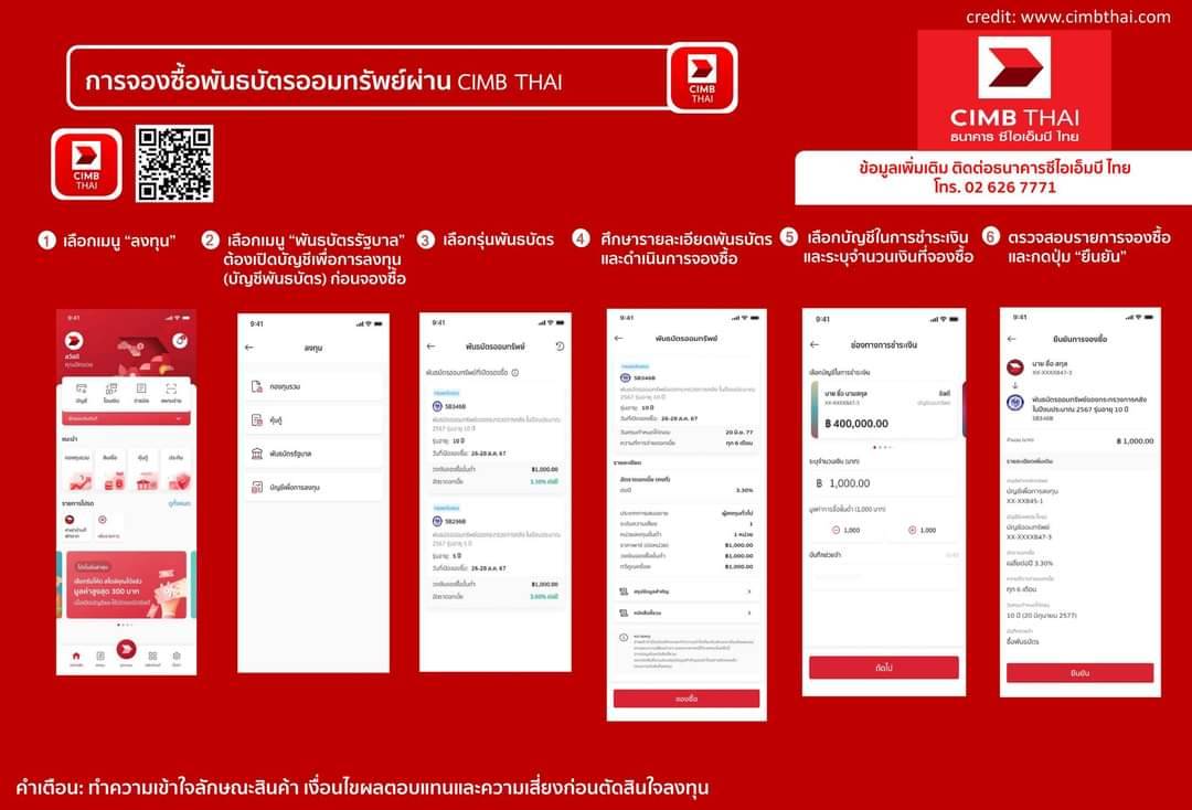 ทั้งนี้ ผู้จองซื้อจะทราบผลการจัดสรรพันธบัตรและได้รับเงินคืน กรณีที่ไม่ได้รับจัดสรรพันธบัตร หรือได้รับจัดสรรไม่ครบตามวงเงินจองซื้อ ในวันที่ 22 สิงหาคม 2567 (รายละเอียดและเงื่อนไขการจำหน่ายเป็นไปตามเอกสารการจำหน่ายพันธบัตรออมทรัพย์ของกระทรวงการคลัง) โดยมีขั้นตอนการซื้อผ่านโมบายแบงก์กิ้ง 6 ธนาคารตัวแทนจำหน่าย ดังนี้
