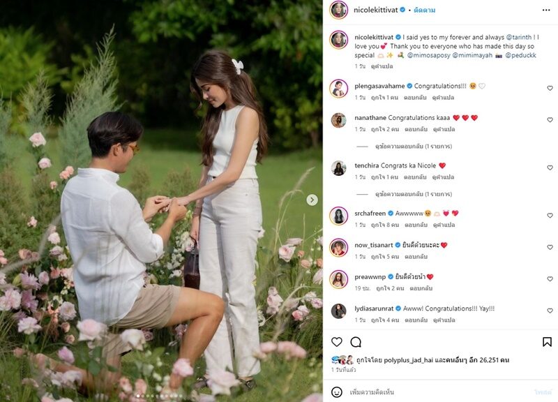 หลังจากนักแสดงสาวนิกกี้ นิโคล กิตติวัฒน์ ประกาศข่าวดีกลางโซเชียล แฟนหนุ่มทำเซอร์ไพรส์คุกเข่าขอแต่งงาน ท่ามกลางคอมเมนต์แสดงความยินดีของเพื่อนพี่น้องแทบจะทั้งวงการและแฟนคลับด้วย โดย นิกกี้ นิโคล ขึ้นแท่นเป็นว่าที่สะใภ้พันล้านแล้วตอนนี้