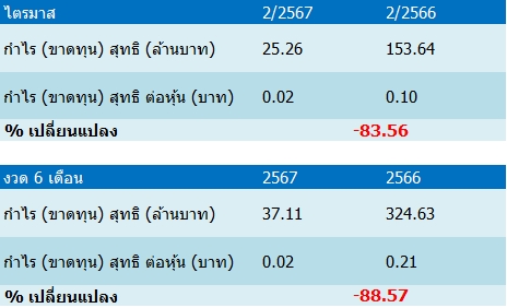 สำหรับราคาหุ้นปรับตัวลง สาเหตุจากผลประกอบการไตรมาส 2/67 มีกำไรสุทธิอยู่ที่ 25.26 ล้านบาท ลดลง 83.56% เมื่อเทียบกับงวดเดียวกันของปีก่อนมีกำไรสุทธิ 153.64 ล้านบาท สาเหตุเกิดจากค่าใช้จ่ายเพิ่มขึ้นมา โดยบริษัทและบริษัทย่อยมีค่าใช้จ่ายรวม เป็นจำนวน 8.463.65 ล้านบาท เทียบกับช่วงเดียวกันของปี 2566 มีค่าใช้จ่ายรวมจำนวน 7,291.30 ล้านบาท ซึ่งแสดงค่าใช้จ่ายของบริษัทและบริษัทย่อยเทียบกับงวดเดียวกันของปีก่อนเพิ่มขึ้นเป็นจำนวน 1,172.35 ล้านบาท โดยค่าใช้จ่ายหลัก ที่สำคัญ ได้แก่ ต้นทุนงานก่อสร้างจำนวน 8,215.03 ล้านบาท