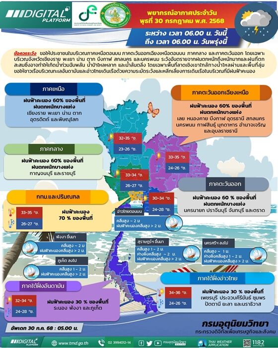 วันที่ 30 ก.ค.2568 กรมอุตุนิยมวิทยา พยากรณ์อากาศ 24 ชั่วโมงข้างหน้า ภาคเหนือตอนบน ภาคตะวันออกเฉียงเหนือตอนบน ภาคกลาง และภาคตะวันออก มีฝนตกหนักบางแห่ง โดยเฉพาะบริเวณจังหวัดเชียงราย พะเยา น่าน ตาก บึงกาฬ สกลนคร และนครพนม