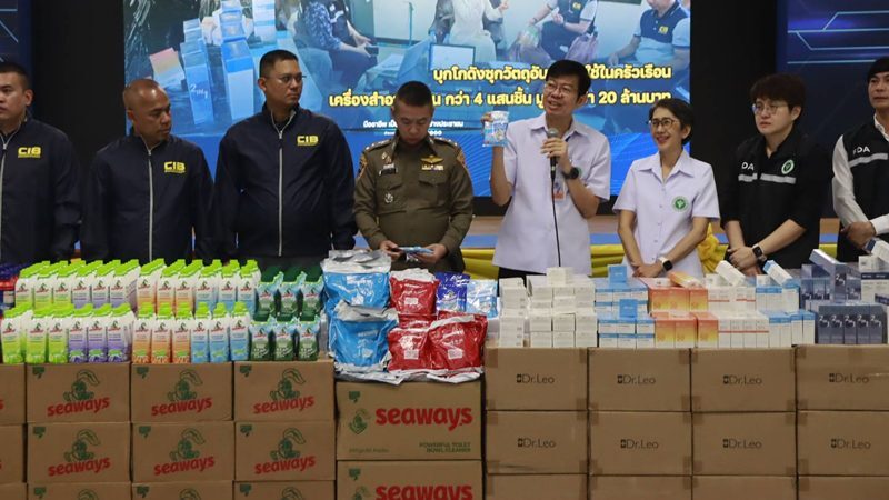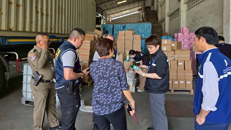 ปคบ. ร่วม อย. บุกค้นโกดังนายทุนจีนซุกวัตถุอันตรายใช้ในครัวเรือน-เครื่องสำอางเถื่อนลอบขายออนไลน์ ยึดของกลางกว่า 4 แสนชิ้น มูลค่ากว่า 20 ล้านบาท