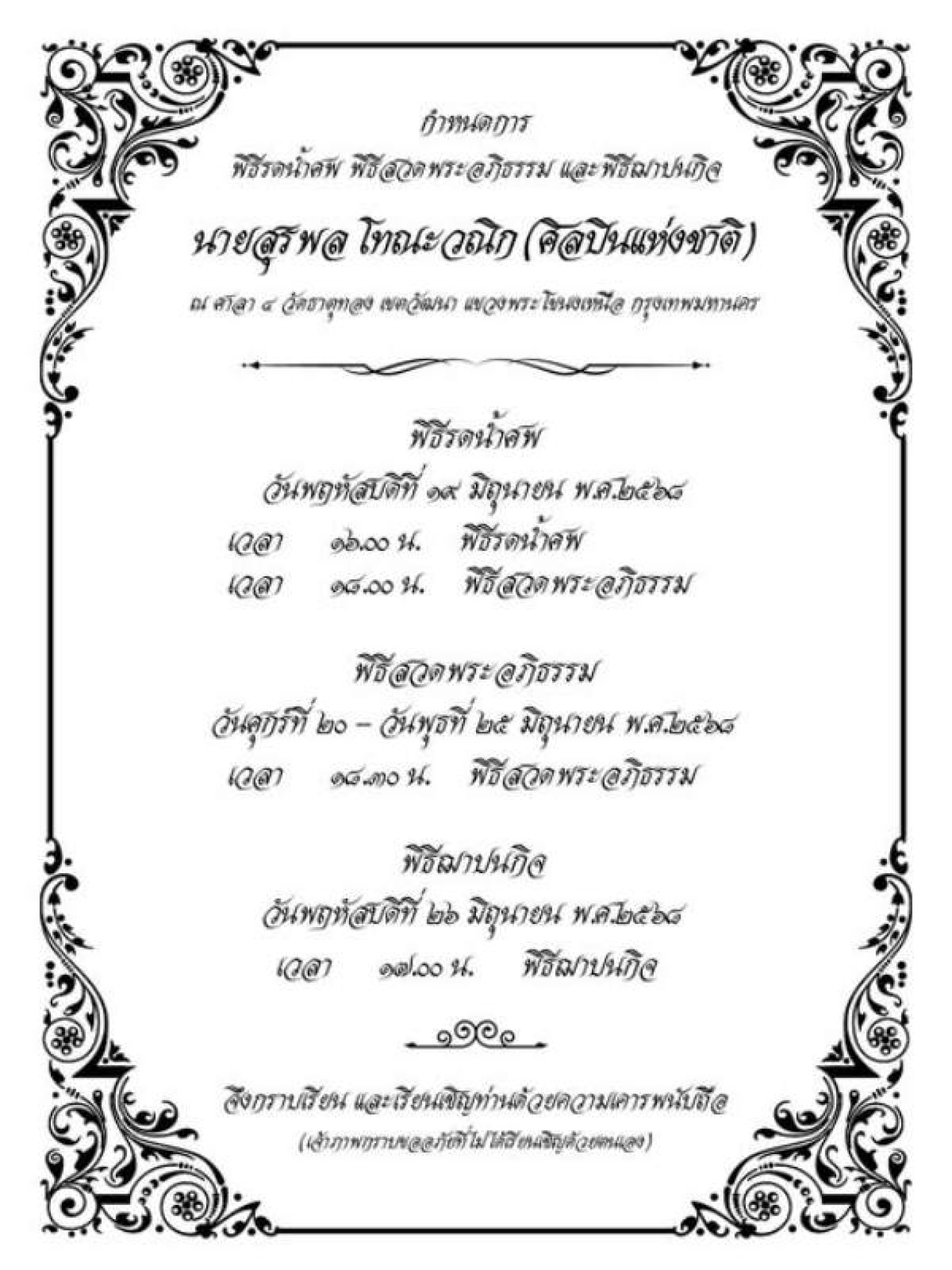 วันที่ 19 มิ.ย.68 เพจเฟซบุ๊ก สุรพลน้อย โทณะวณิก โพสต์แจ้งข่าวเศร้าถึงการเสียชีวิตของ สุรพล โทณะวณิก ศิลปินแห่งชาติ สาขาศิลปะการแสดง (เพลงไทยสากล-ประพันธ์) อายุ 98 ปี โดยจัดพิธีรดน้ำศพในวันที่ 19 มิ.ย. เวลา 16.00 น. และสวดพระอภิธรรม 19-25 มิ.ย. เวลา 18.30 น. ณ ศาลา 4 วัดธาตุทอง เขตวัฒนา กรุงเทพฯ ส่วนพิธีฌาปนกิจ 26 มิ.ย.