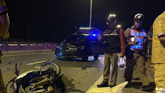 2หนุ่ม ขี่จยย.ย้อนศร ถูกเบนซ์พุ่งชนเต็มแรง ร่างกระเด็นดับสลดคู่