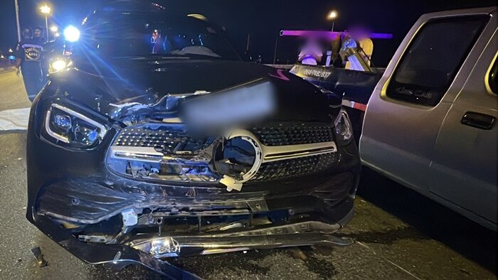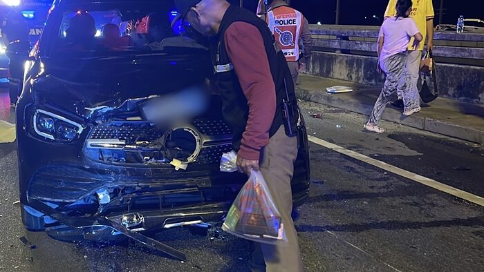 ที่เกิดเหตุบนสะพานต่างระดับข้ามถนนรังสิต-นครนายกเหนือห้างดูโฮม เส้นธัญบุรี-วังน้อย เจ้าหน้าที่ตำรวจรถเก๋ง ยี่ห้อเมอร์เซเดสเบนซ์ รุ่นจีแอลซี 220ดี สีดำ ทะเบียน กรุงเทพมหานคร สภาพด้านหน้าพังยับ ด้านหลังรถพบศพชายวัยรุ่นนุ่งกางเกงขาสั้นสีน้ำเงิน เสื้อยืดสีขาว นอนคว่ำหน้าเสียชีวิต 1 ราย