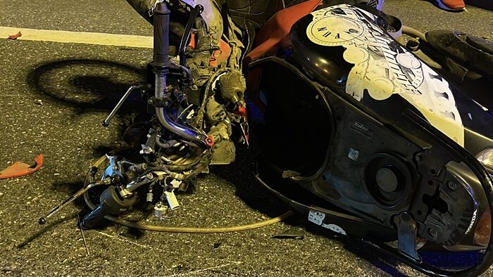 ห่างกันประมาณ 10 เมตร พบรถจักรยานยนต์ ยี่ห้อฮอนด้า รุ่นสกู๊ปปี้ไอ สีดำแดง ไม่ติดแผ่นป้ายทะเบียน สภาพโดนชนด้านหน้ารถพังยับ ใกล้กันพบศพชายไม่ทราบชื่อนอนคว่ำหน้าอยู่ข้างรถ