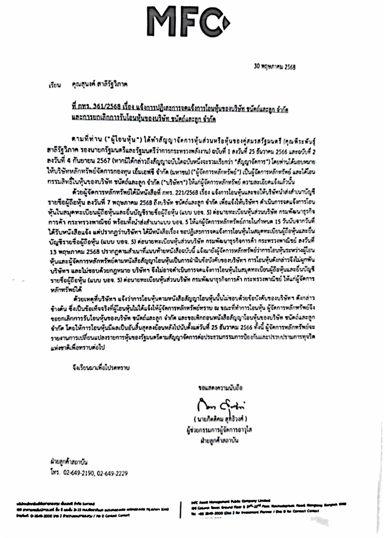 ต่อมาวันที่ 30 พ.ค. 2568 MFC แจ้งนางสุนงค์ว่า ขอยกเลิกการรับโอนหุ้นของบริษัท ชนัตถ์และลูก จำกัด และขอเพิกถอนหนังสือสัญญาโอนหุ้นทั้ง 2 ฉบับของบริษัทชนัตถ์และลูก จำกัด โดยให้การโอนหุ้นสิ้นสุดลงและมีผลย้อนหลังตั้งแต่วันที่ 25 ธ.ค. 2566 เสมือนไม่เคยมีการโอนหุ้นกันมาก่อน ทั้งนี้ ผู้จัดการหลักทรัพย์จะรายงานการเปลี่ยนแปลงรายการหุ้นของรัฐมนตรีตามสัญญาจัดการหุ้นต่อประธาน ป.ป.ช. เพื่อทราบต่อไป