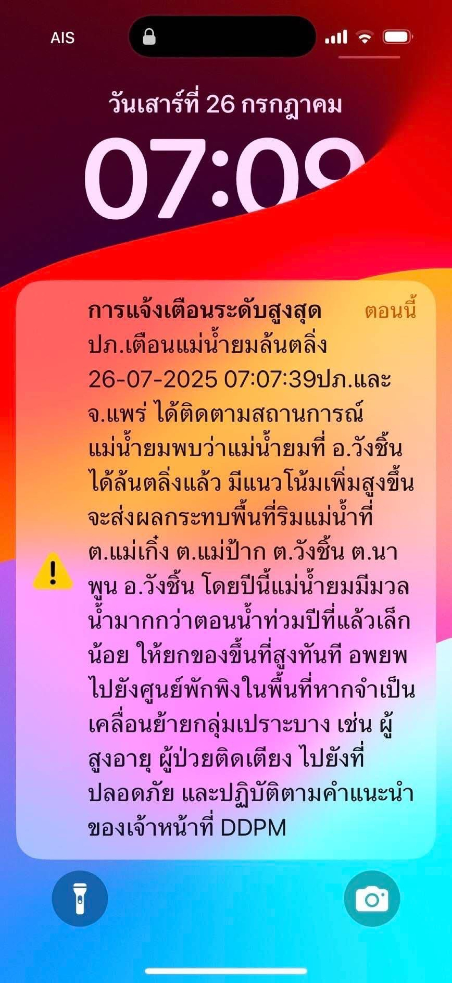 “ปภ. ได้มีการส่งสัญญาณแจ้งเตือนภัยผ่าน Cell Broadcast เพื่อแจ้งเตือนประชาชนที่อยู่ในพื้นที่เสียงภัยมาอย่างต่อเนื่อง โดยตั้งแต่วันที่ 20 กรกฎาคม 2568 เป็นต้นมาจนถึงปัจจุบัน (ข้อมูล ณ 26 กรกฎาคม 2568 เวลา 07.00 น. ได้มีการแจ้งเตือนผ่านระบบ Cell Broadcast รวม 47 ครั้ง แยกเป็น อุทกภัย 38 ครั้ง และดินโคลนถล่ม 9 ครั้ง นอกจากนี้ เมื่อช่วงเช้าของวันนี้ (26 ก.ค.68) กรมป้องกันและบรรเทาสาธารณภัย โดยศูนย์เตือนภัยพิบัติแห่งชาติ (ศภช.) ได้ติดตามสถานการณ์น้ำแม่น้ำยมในพื้นที่ อำเภอวังชิ้น จังหวัดแพร่ และจังหวัดสุโขทัย พบว่า ระดับน้ำได้เริ่มล้นตลิ่งแล้ว และระดับน้ำเพิ่มสูงขึ้น จึงได้แจ้งเตือนภัยผ่านระบบ Cell Broadcast 2 ครั้ง โดยแจ้งเตือนไปยังพื้นที่ริมแม่น้ำตำบลแม่เกิ๋ง ตำบลแม่ป้าก ตำบลวังชิ้น ตำบลนาพูน อำเภอวังชิ้น จังหวัดแพร่ และพื้นที่ริมแม่น้ำที่ตำบลวังใหญ่ ตำบลวังทอง อำเภอศรีสำโรง และตำบลปากแคว ตำบลยางซ้าย ตำบลปากพระ ตำบลธานี อำเภอเมืองสุโขทัย จังหวัดสุโขทัย ให้ยกของขึ้นที่สูงทันที รีบเคลื่อนย้ายรถไปในที่สูง อพยพไปยังศูนย์พักพิงในพื้นที่หากจำเป็น เคลื่อนย้ายกลุ่มเปราะบาง เช่น ผู้สูงอายุ ผู้ป่วยติดเตียง ไปยังที่ปลอดภัย และปฏิบัติตามคำแนะนำของเจ้าหน้าที่ ทั้งนี้ หากจังหวัดใดพบสถานการณ์ภัยรุนแรงและอาจกระทบต่อประชาชน ให้รีบแจ้งศูนย์เตือนภัยพิบัติ ปภ. ทันที เพื่อส่ง Cell Broadcast แจ้งเตือนประชาชน“ นายภาสกร อธิบดี ปภ. กล่าว