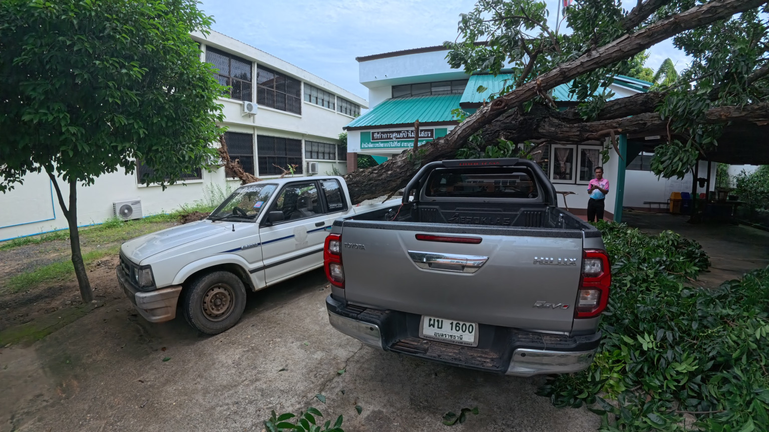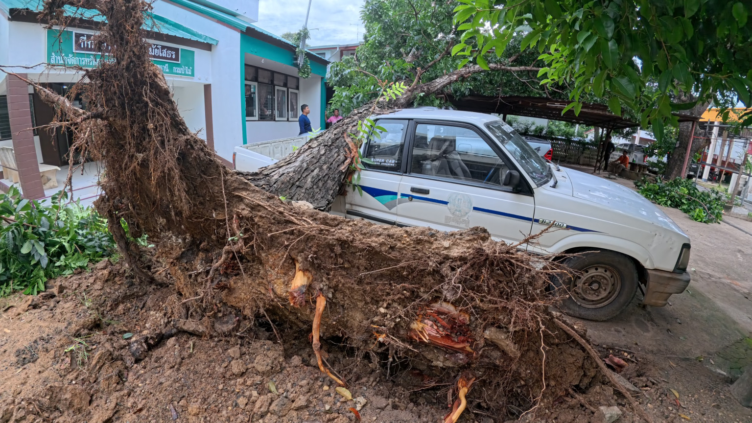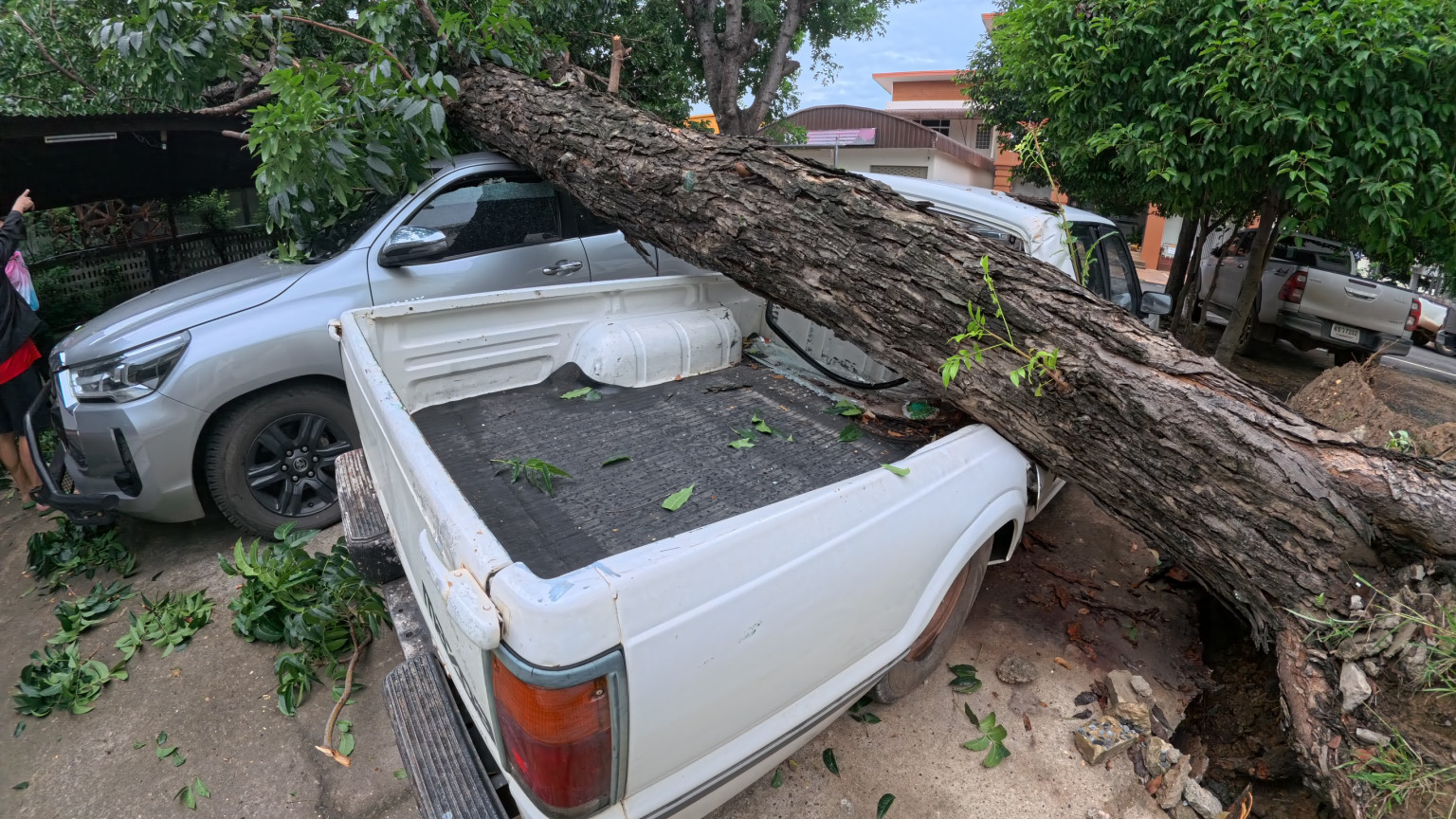 ยโสธรฝนตกลมพัดแรงทำให้ต้นไม้ใหญ่ล้มทับรถยนต์กระบะเสียหาย 2 คัน
