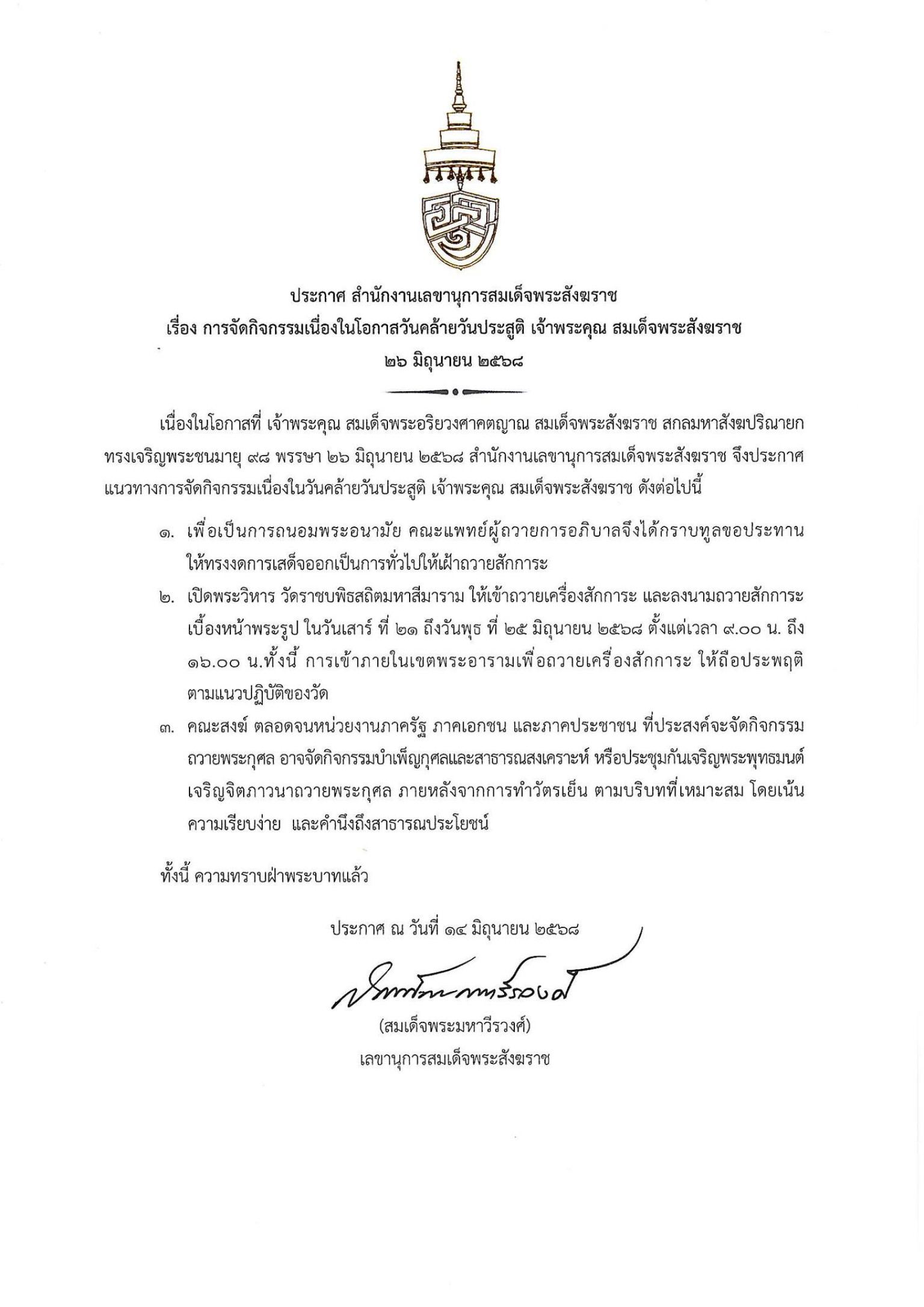 ประกาศแนวทางจัดกิจกรรมวันคล้ายวันประสูติ “สมเด็จพระสังฆราช” 98 พรรษา 26 มิ.ย. 68