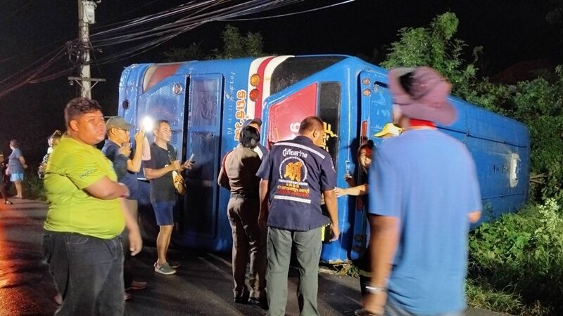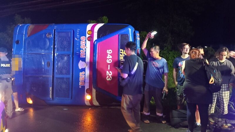 ระทึกทั้งคัน รถทัวร์ฝ่าฝน ถนนลื่นคว่ำตกถนน 30 ชีวิตสุดช็อก กู้ภัย-พลเมืองดีทุบกระจกช่วยออกมาจากรถ พาคนเจ็บส่งโรงพยาบาล