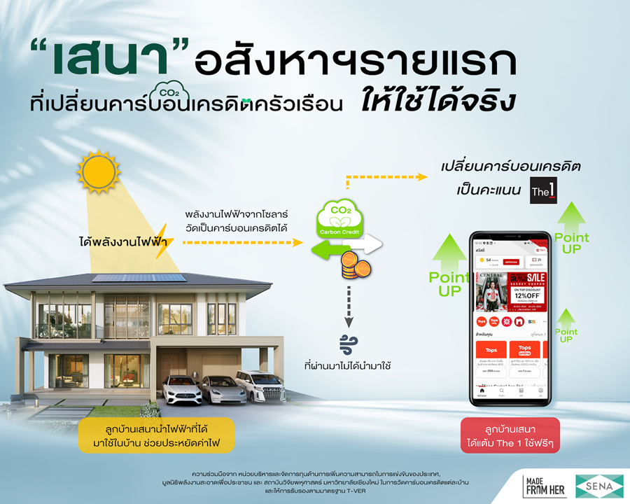 เสนา ผู้พัฒนาอสังหาริมทรัพย์รายแรกที่ติดตั้งโซลาร์เซลล์ให้บ้านทุกหลัง เดินหน้าตอกย้ำความเป็นผู้นำบ้านโซลาร์เซลล์อีกครั้ง กับปรากฏการณ์ครั้งแรกของวงการอสังหาฯ ลูกบ้านเสนาสามารถเปลี่ยนคาร์บอนเครดิตครัวเรือนให้มีมูลค่า นำไปใช้เป็นส่วนลดหรือซื้อสินค้าได้จริง…. เสนา ดีเวลลอปเม้นท์ ร่วมโครงการตลาดคาร์บอนครัวเรือน ภาคสมัครใจ โดยความร่วมมือระหว่างมูลนิธิพลังงานสะอาดเพื่อประชาชน (มพช.), หน่วยบริหารและจัดการทุนด้านการเพิ่มความสามารถในการแข่งขันของประเทศ (บพข.), สถาบันวิจัยพหุศาสตร์ มหาวิทยาลัยเชียงใหม่ และ กลุ่มเซ็นทรัล The 1 Card ในการนำคาร์บอนเครดิตครัวเรือน มาแลกเป็นคะแนน The 1 ได้ฟรี