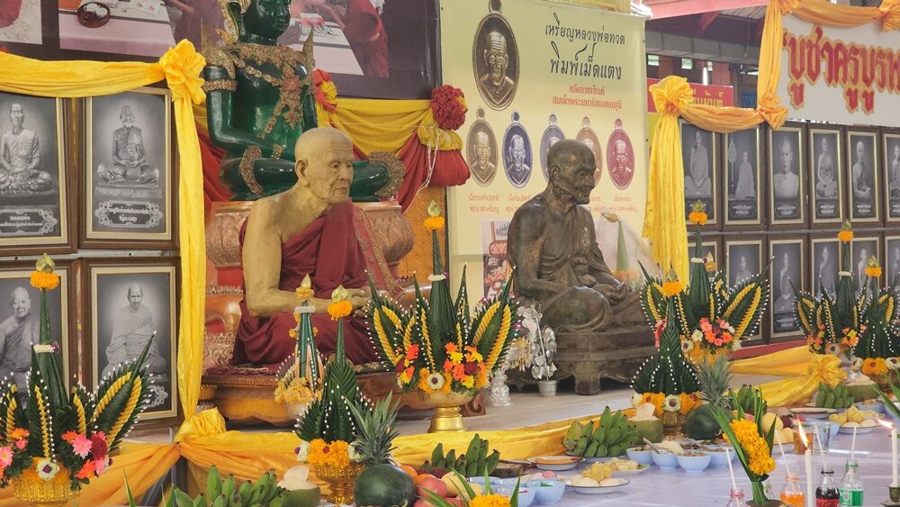 โดยผู้เข้าพิธีจะนำผลไม้ 9 ชนิด อาหาร 9 อย่าง พืชผัก 9 ชนิด นำมาเป็นเครื่องบวงสรวงบูชา ผู้สื่อข่าวรายงานอีกว่า สำหรับการไหว้ครูบูรพาจารย์ในครั้งนี้ มีบรรดาศิษยานุศิษย์ และประชาชนมาร่วมพิธีร่วม 2 พันคน ต้องเข้าแถวเดินให้หลวงพ่อแป๊ะเจิมหน้า ทีละคนใช้เวลาข้ามคืนกว่าจะเสร็จสิ้น