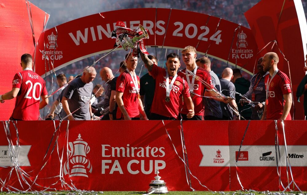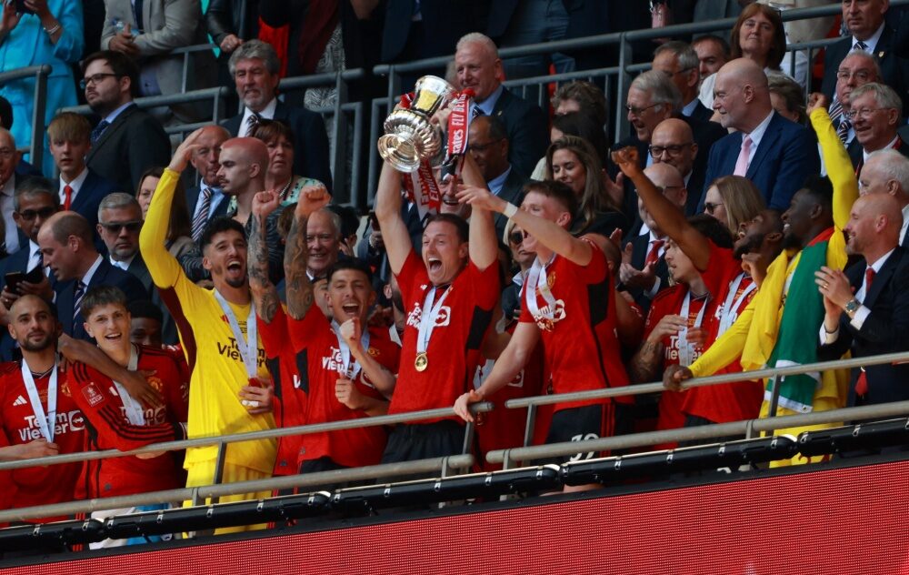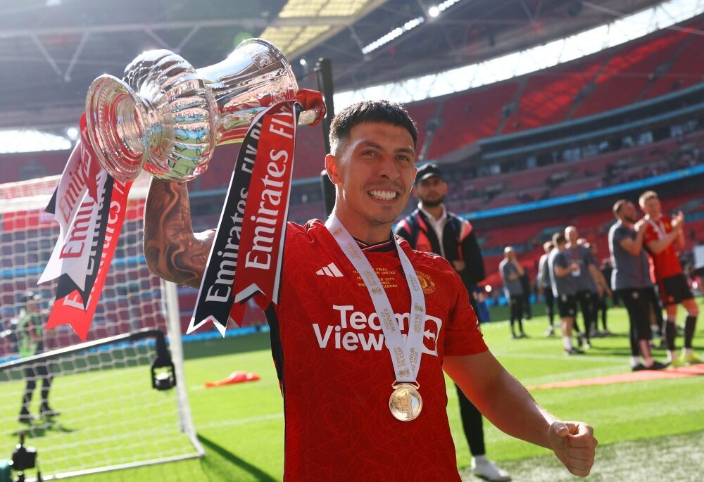 Soccer Football - FA Cup - Final - Manchester City v Manchester United - Wembley Stadium, London, Britain - May 25, 2024 Manchester United's Lisandro Martinez celebrates with the trophy after winning the FA Cup REUTERS/Hannah Mckay
