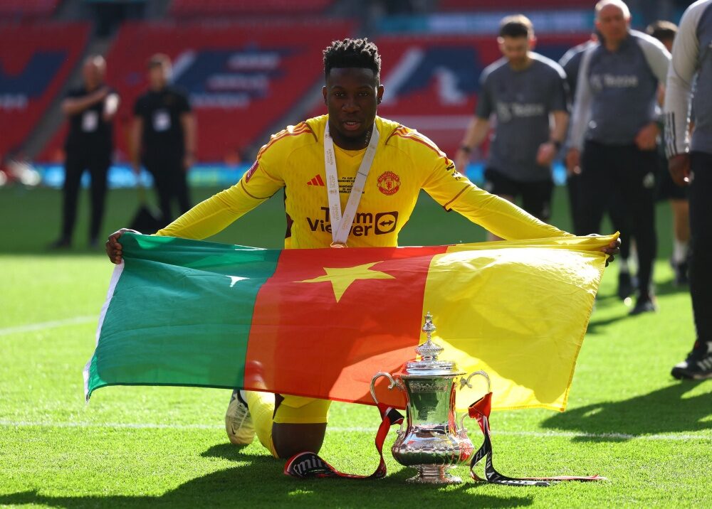Soccer Football - FA Cup - Final - Manchester City v Manchester United - Wembley Stadium, London, Britain - May 25, 2024 Manchester United's Andre Onana celebrates with the trophy after winning the FA Cup REUTERS/Hannah Mckay