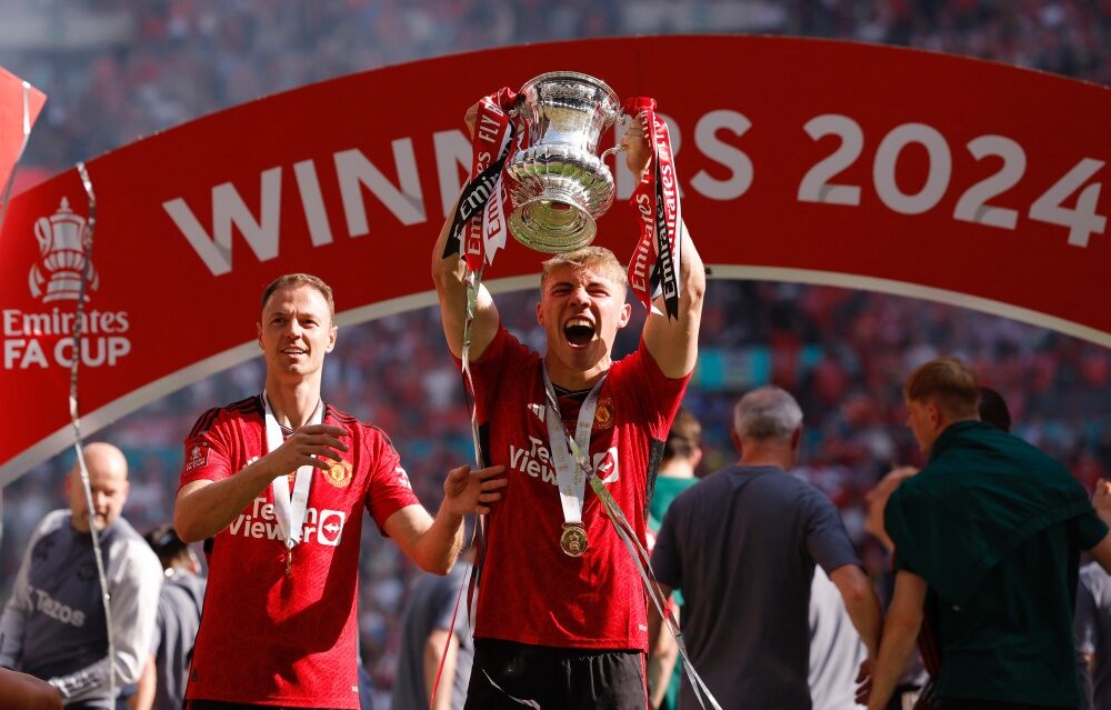 Soccer Football - FA Cup - Final - Manchester City v Manchester United - Wembley Stadium, London, Britain - May 25, 2024 Manchester United's Rasmus Hojlund celebrates with the trophy after winning the FA Cup Action Images via Reuters/Andrew Couldridge