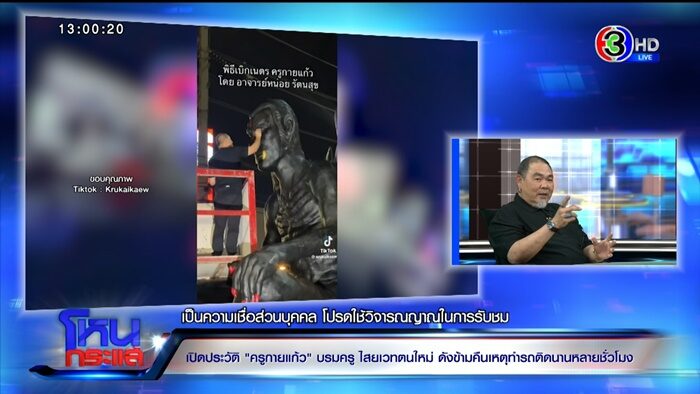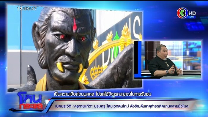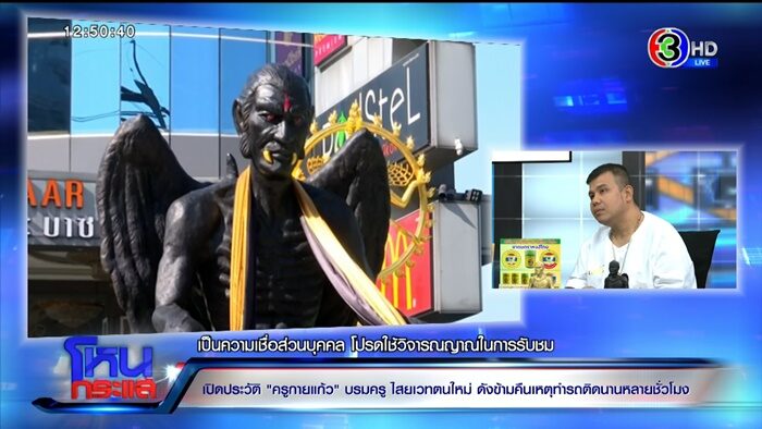 กรณีรถบรรทุกรูปปั้น “ครูกายแก้ว” เทพเจ้าแห่งโชคลาภ ติดคานสะพานลอยคนข้าม ขณะจะนำรูปปั้นไปตั้งไว้หน้าโรงแรมบาซาร์ รัชดา เพื่อทำพิธีเบิกเนตร จนทำให้การจราจรติดขัดเป็นอย่างมากเมื่อวันก่อน กลายเป็นไวรัล ถูกวิพากษ์วิจารณ์ในสังคม มีทั้งคนที่เชื่อและไม่เชื่อ