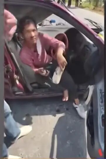สภาพคนขับรถเก๋ง นั่งอยู่ในรถขาติดออกมาไม่ได้ แต่ไม่เป็นอะไรมาก สวนทางกับสภาพรถที่เห็น