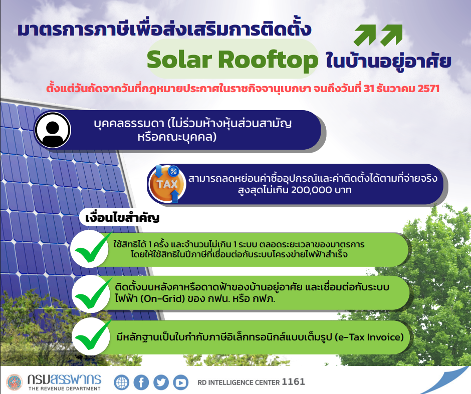 ราชกิจจานุเบกษา ประกาศยกเว้นภาษีเงินได้ สำหรับค่าซื้ออุปกรณ์และค่าติดตั้งระบบโซล่าเซลล์ในบ้านอยู่อาศัย สามารถนำมาลดหย่อนภาษีได้สูงสุด200,000 บาท มีผลบังคับใช้ตั้งแต่3 มีนาคม2569 – 31 ธันวาคม2571