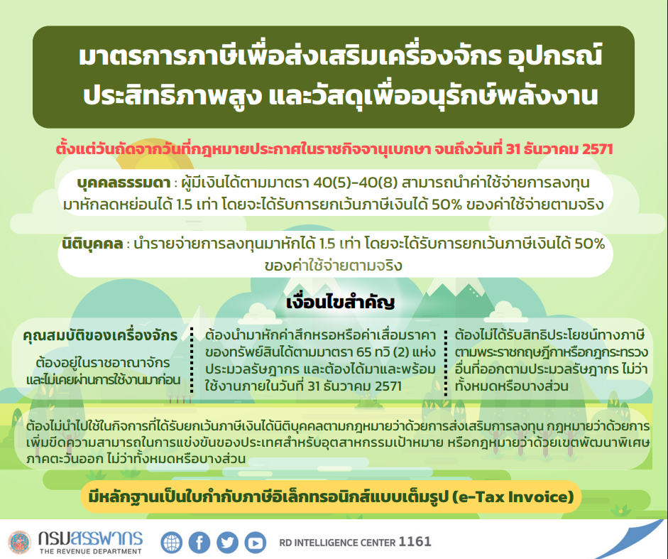 มาตรา4 ให้ยกเว้นภาษีเงินได้ตามส่วน2 และส่วน3 หมวด3 ในลักษณะ2 แห่งประมวลรัษฎากร ให้แก่บุคคลธรรมดา ซึ่งมีเงินได้พึงประเมินตามมาตรา40 (5) (6) (7) และ(8) แห่งประมวลรัษฎากร และบริษัทหรือห้างหุ้นส่วนนิติบุคคล สำหรับเงินได้เป็นจำนวนร้อยละห้าสิบของเงินได้เท่าที่ได้จ่ายเป็นค่าใช้จ่ายในการลงทุนในเครื่องจักรหรืออุปกรณ์ที่มีประสิทธิภาพสูง หรือวัสดุหรืออุปกรณ์เพื่อการอนุรักษ์พลังงานที่มีผลต่อการประหยัดพลังงาน