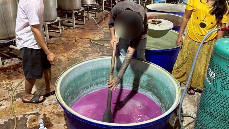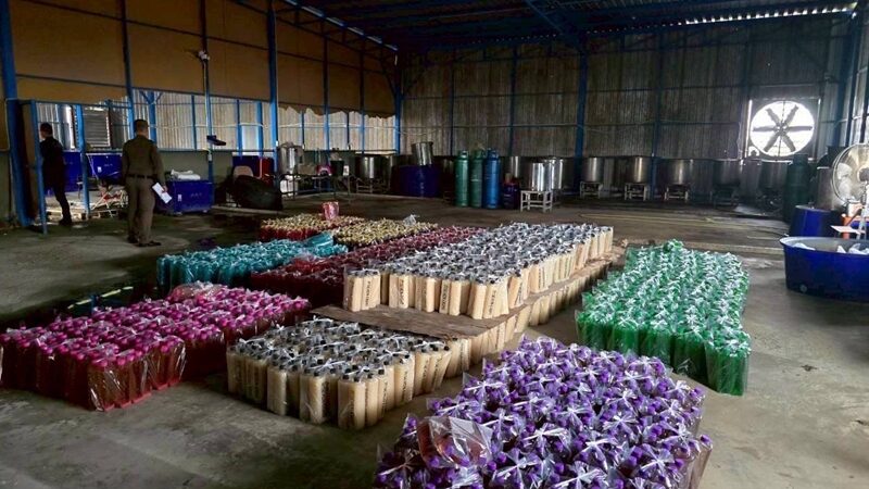 - เป็นโกดังผลิตเครื่องดื่ม พบ น.ส.เทียน อายุ 19 ปี สัญชาติเมียนมา กำลังต้มใบกระท่อมในหม้อ ก่อนผสมน้ำเชื่อมรสต่าง ๆ ใช้แรงงานต่างด้าวกรอกใส่ขวดโดยไม่สวมถุงมือตรวจยึดน้ำหวานสีต่าง ๆ กว่า 16 สี ของเหลวบรรจุแกลลอน 20 ลิตร และอุปกรณ์การผลิตจำนวนมาก ซึ่งสถานที่ก็ไม่ได้รับอนุญาตและไม่ถูกสุขลักษณะด้วย