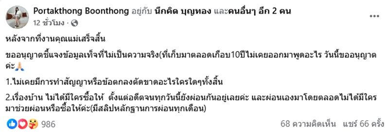 ทั้งนี้ แจกัน ปอถักทอง น้องสาวของอดีตนางเอกดัง กุญแจซอล ได้ออกมาโพสต์ชี้แจงข้อมูลความจริง หลังเสร็จสิ้นงานศพคุณแม่ด้วยว่า
