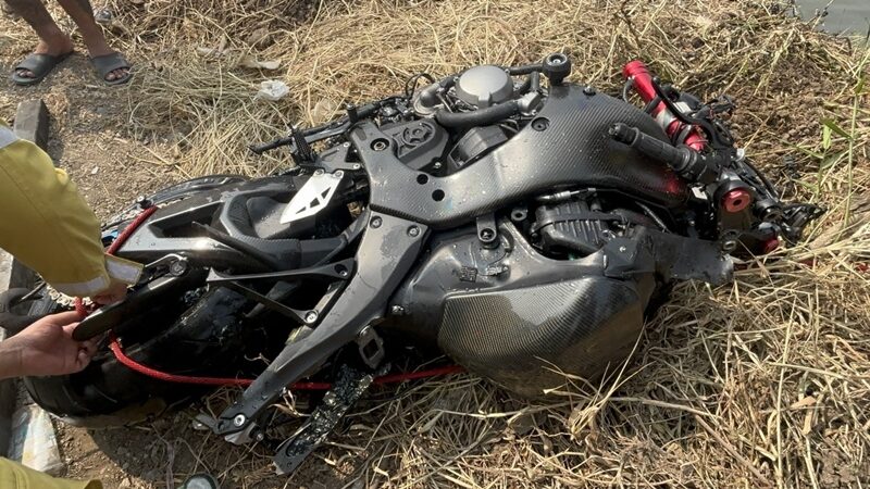 ชิ้นส่วนรถบิ๊กไบก์ที่กระจายอยู่บนพื้นถนน